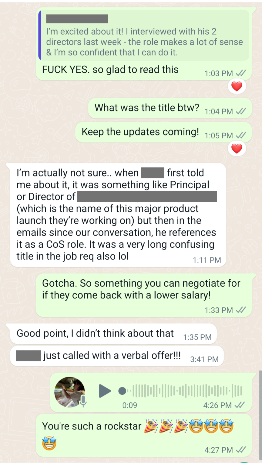 …When we started, Karina was a Senior Manager at a Series B startup, with a Business Operations title. After a few months of our work together, she joined a Fortune 100 company as a Chief of Staff — and she’s going to be making $65K more in base salary alone.